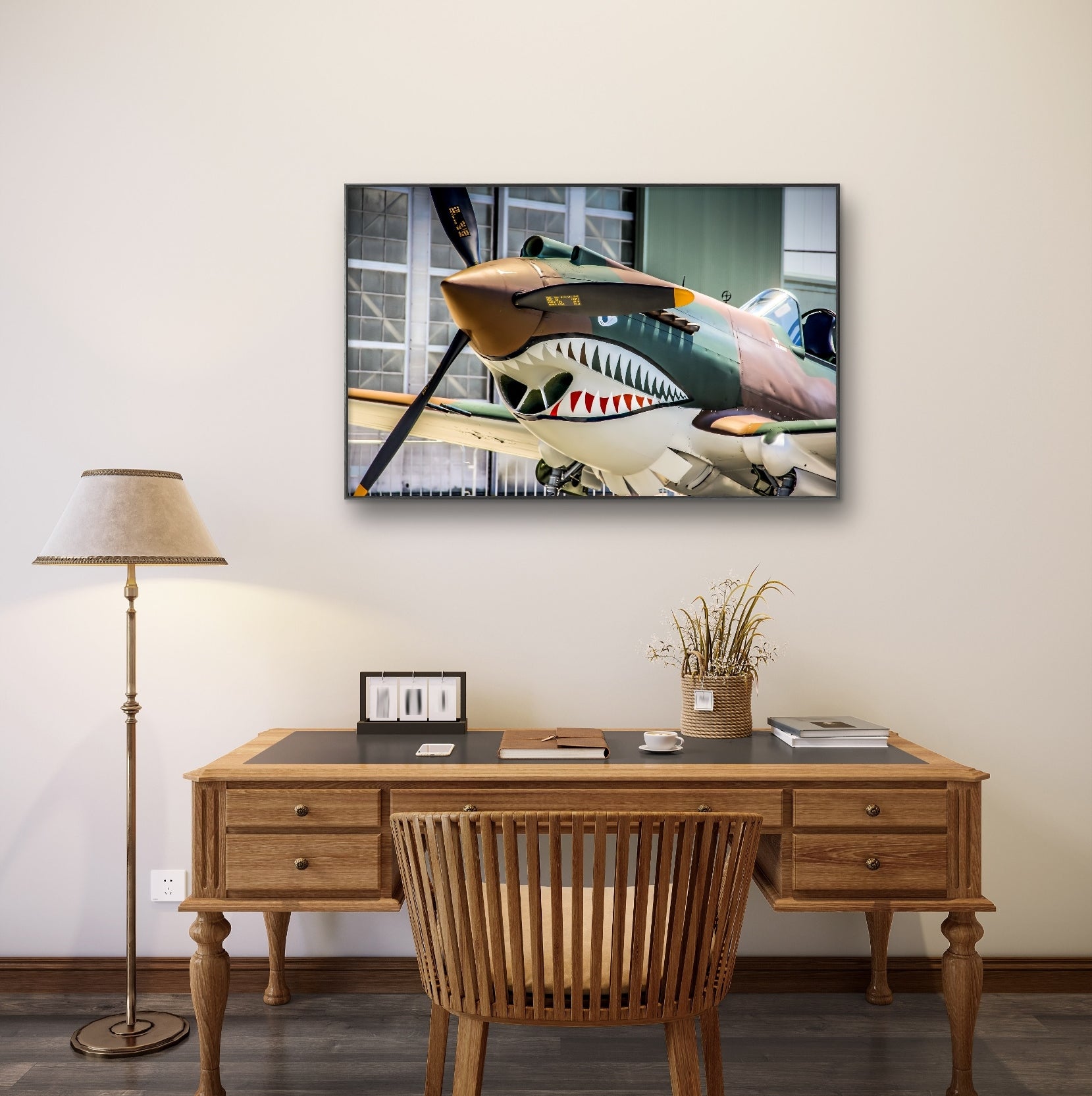 This image showcases the 'Flying Tiger' shark teeth of the American Volunteer Group (AVG) in China. Photo was taken at a Flying Heritage Collection fly day in Everett, WA. This particular aircraft is a combat veteran. Initially built for the US Army Air Corps, it was purchased by the British along with nine other P-40Cs. Subsequently supplied to the Russians, she arrived via convoy at Murmansk in January 1942 and was issued to a Russian fighter unit. Over the next several months she saw service on the Karelian Front in the defense of Murmansk, and was shot down on September 27th, 1942. Having been hit in the oil tank her pilot, Major Ermakov, made a belly landing south of Murmansk where she lay for some fifty-one years before being discovered by a satellite photo. Add a slim, black floating frame to really set off this image. Your satisfaction is absolutely guaranteed and shipping is free!