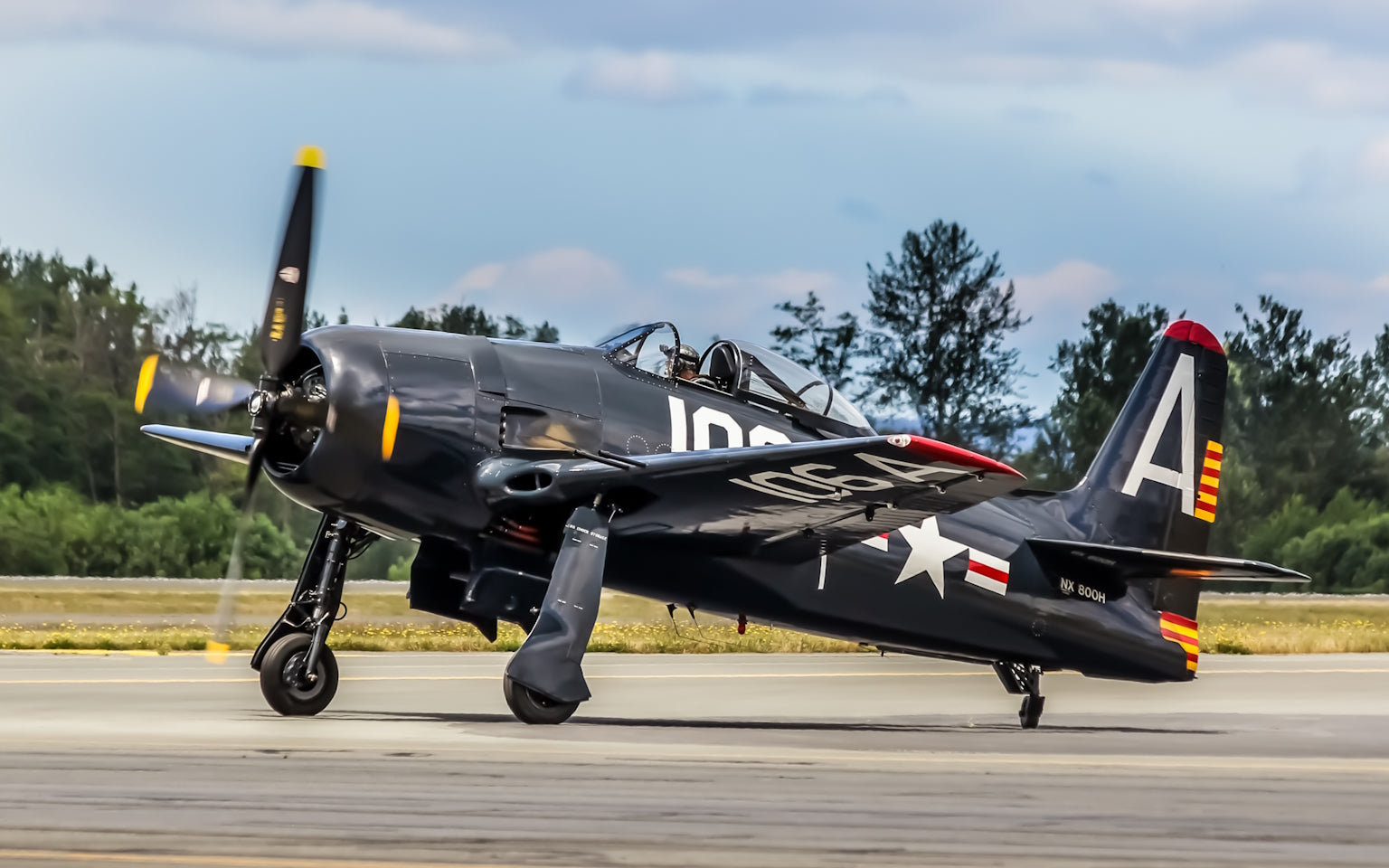 This Grumman 'Bearcat' resides in the Pacific Northwest. It is amazing to see, and hear, up close. Grumman engineers put the largest engine possible in the most streamlined fuselage to get the maximum performance. F8F prototypes were ordered in November 1943 and first flew on 21 August 1944, a mere nine months later. The first combat for the Bearcat was during the French Indochina War (1946–1954) when approximately 200 Bearcats were delivered to the French forces in 1951. An unmodified production F8F-1 set a 1946 time-to-climb record of 10,000 feet (3,048 m) in 94 seconds. The Bearcat held this record for 10 years until it was broken by a jet fighter. Add a slim, black floating frame to really set off this image. Your satisfaction is absolutely guaranteed and shipping is free!