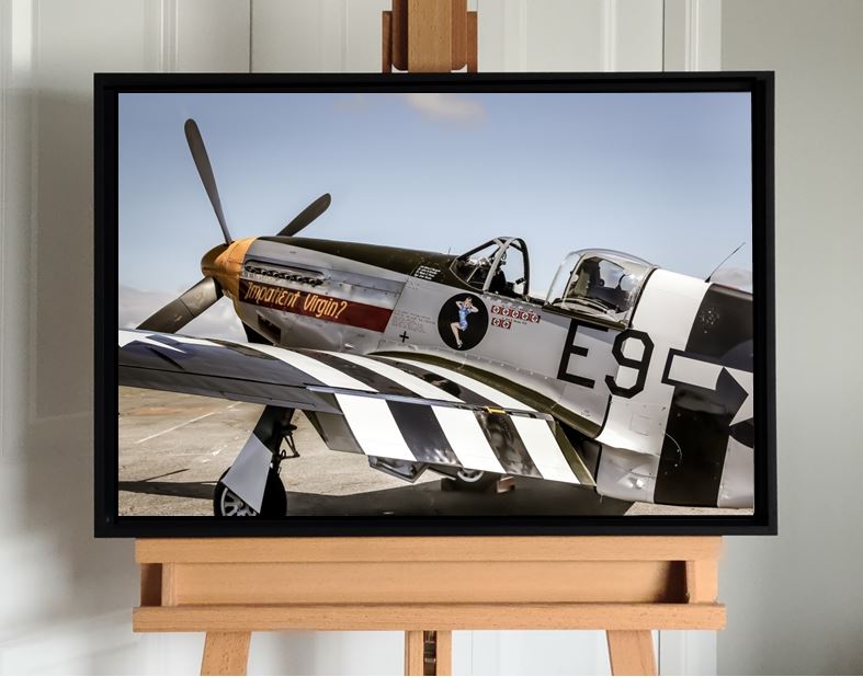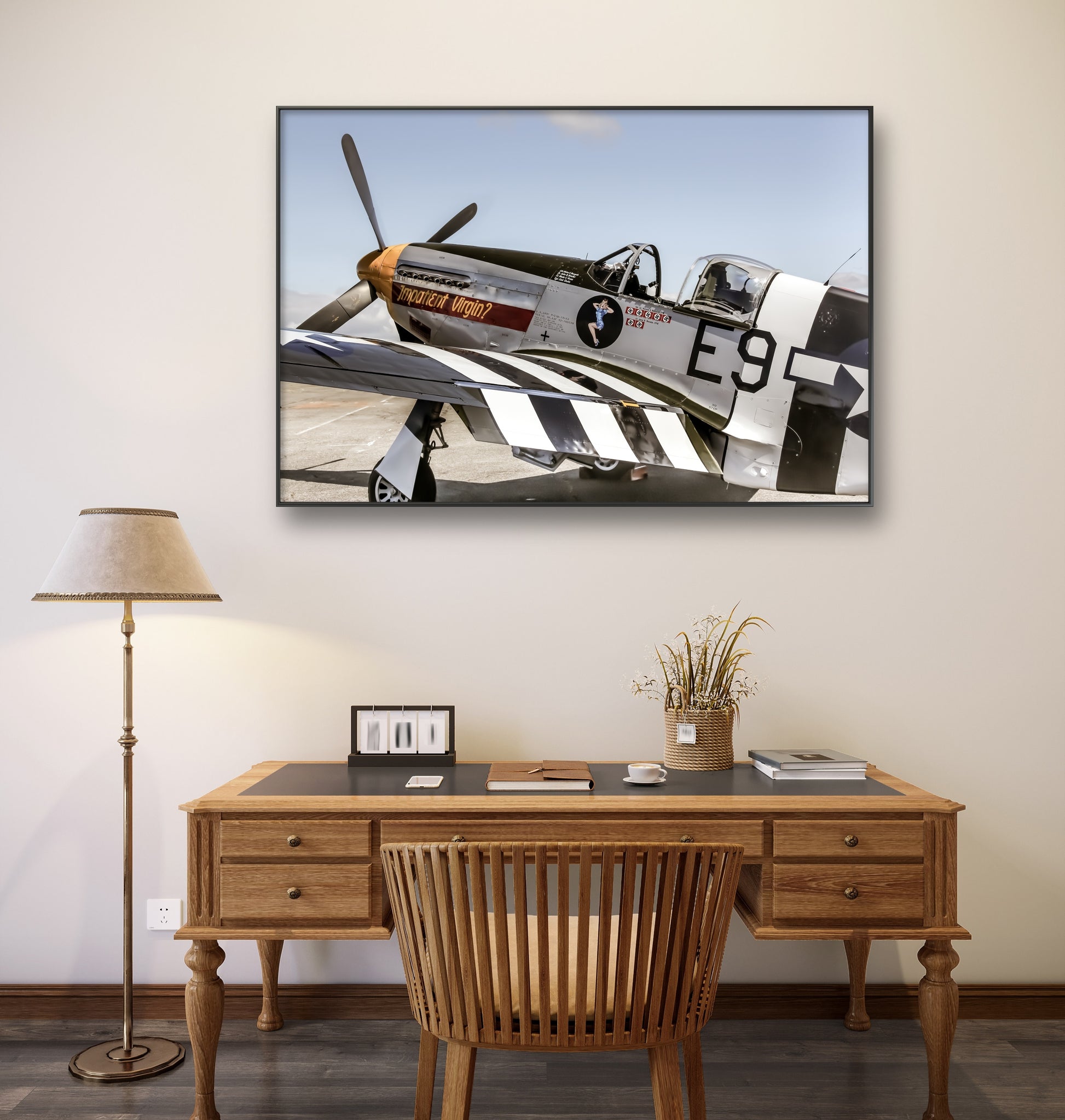 The 'B' model of the Mustang is identified by the rounded bubble canopy known as the 'Malcolm Hood'. Black and white D-Day invasion stripes are painted on the wings and aft section of the fuselage to identify it as friendly to Allied troops. Add a slim, black floating frame to really set off this image. Your satisfaction is absolutely guaranteed and shipping is free!