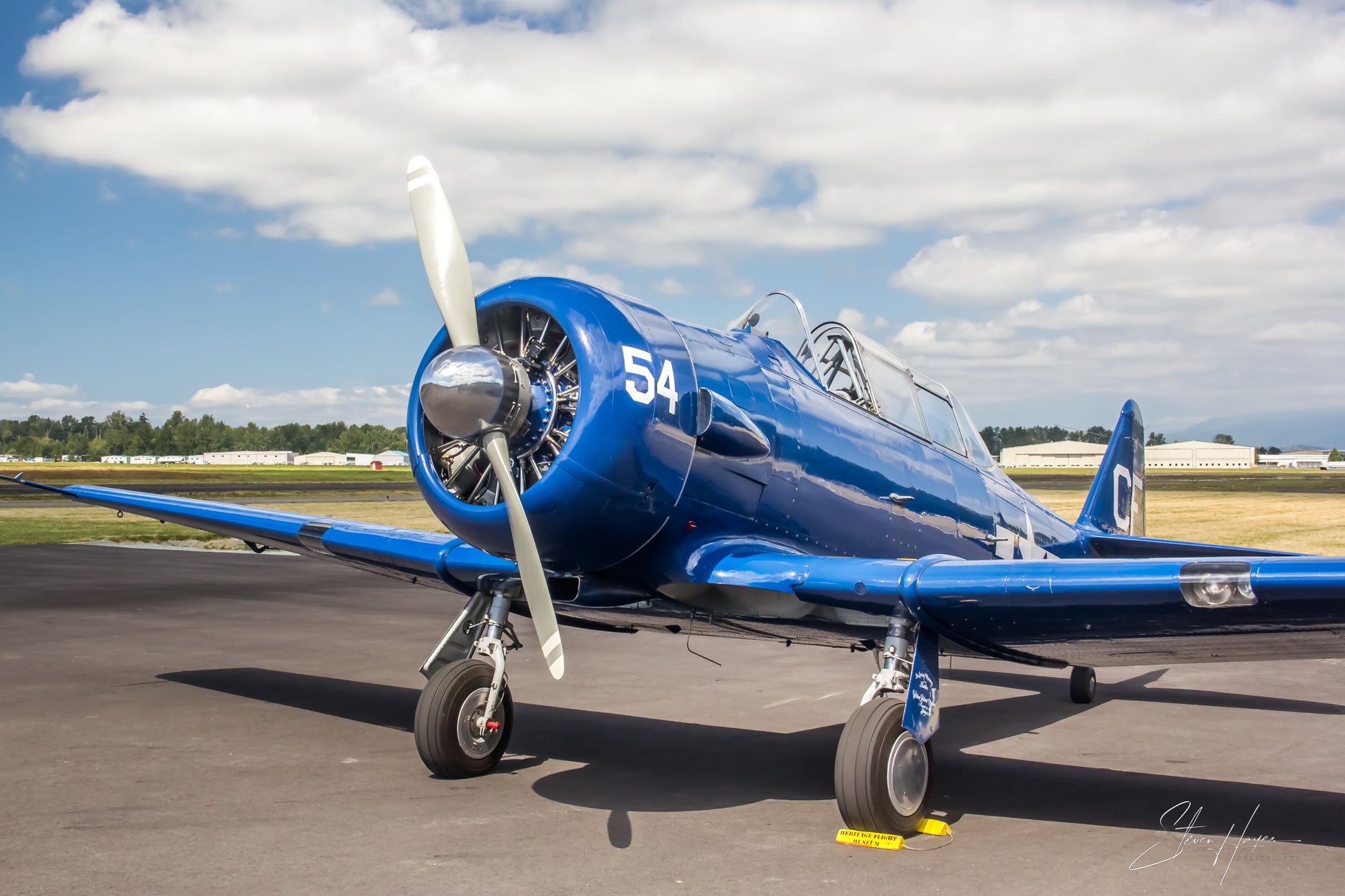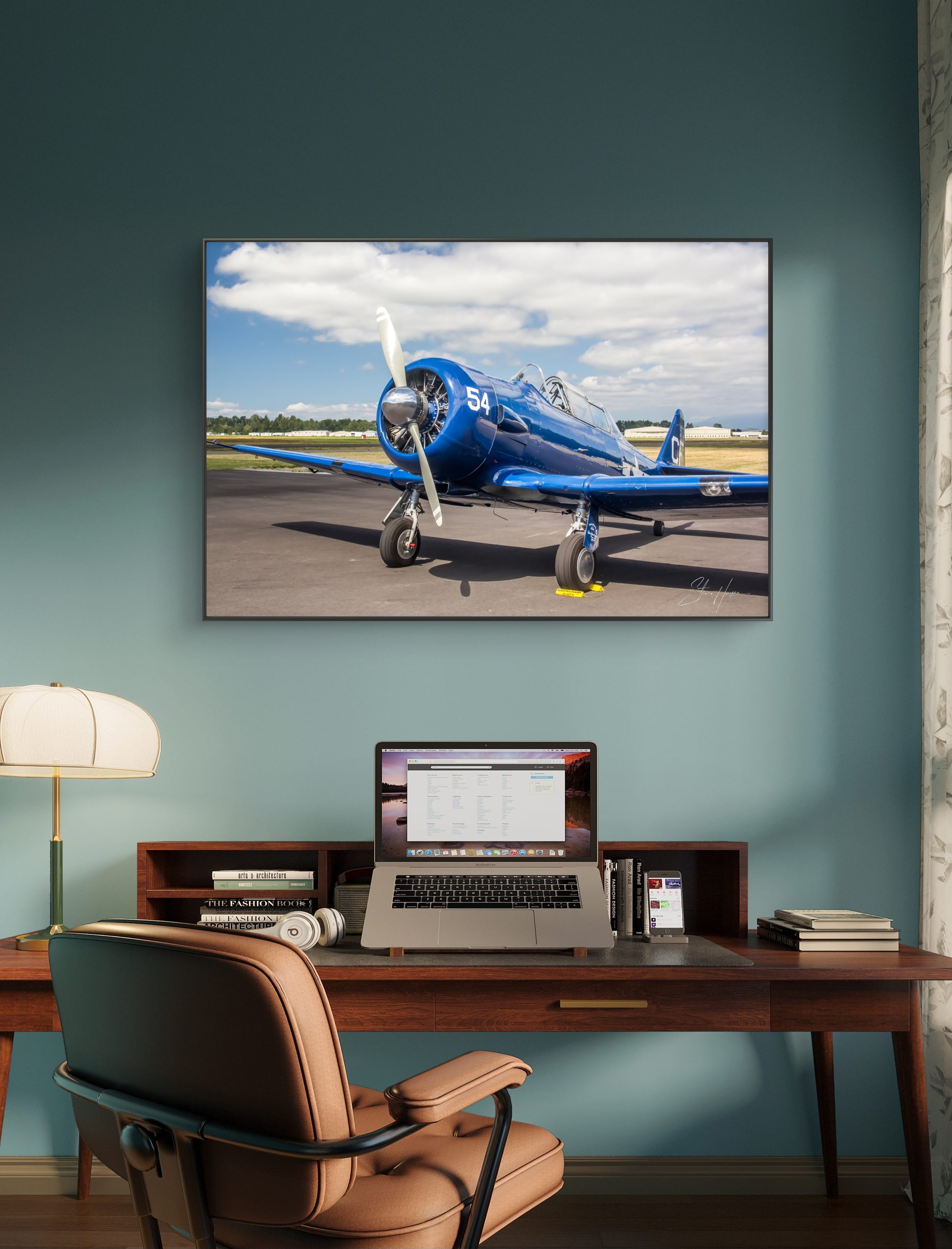 The "SNJ" was the U.S. Navy version of the Air Force T-6. An exceptionally well-designed and built Navy trainer, the Texan entered service with the U.S. military in 1935 and served into the 1950s. Over 17,000 aircraft were delivered to the U.S. military. It was operated by nearly sixty foreign nations making it THE most widely used trainer, ever. Add a slim, black floating frame to really set off this image. Your satisfaction is absolutely guaranteed and shipping is free!