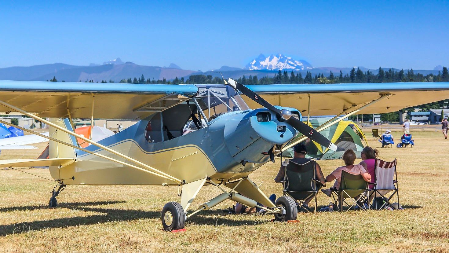 A Piper Cub parked in the grass on a sunny day, spectators watching the air show in its shade. Photo was taken at the Arlington Airport in Washington at the annual EAA fly-in. The mountain in the distance is Three Fingers Peak. Add a slim, black floating frame to really set off this image. Your satisfaction is absolutely guaranteed and shipping is free!