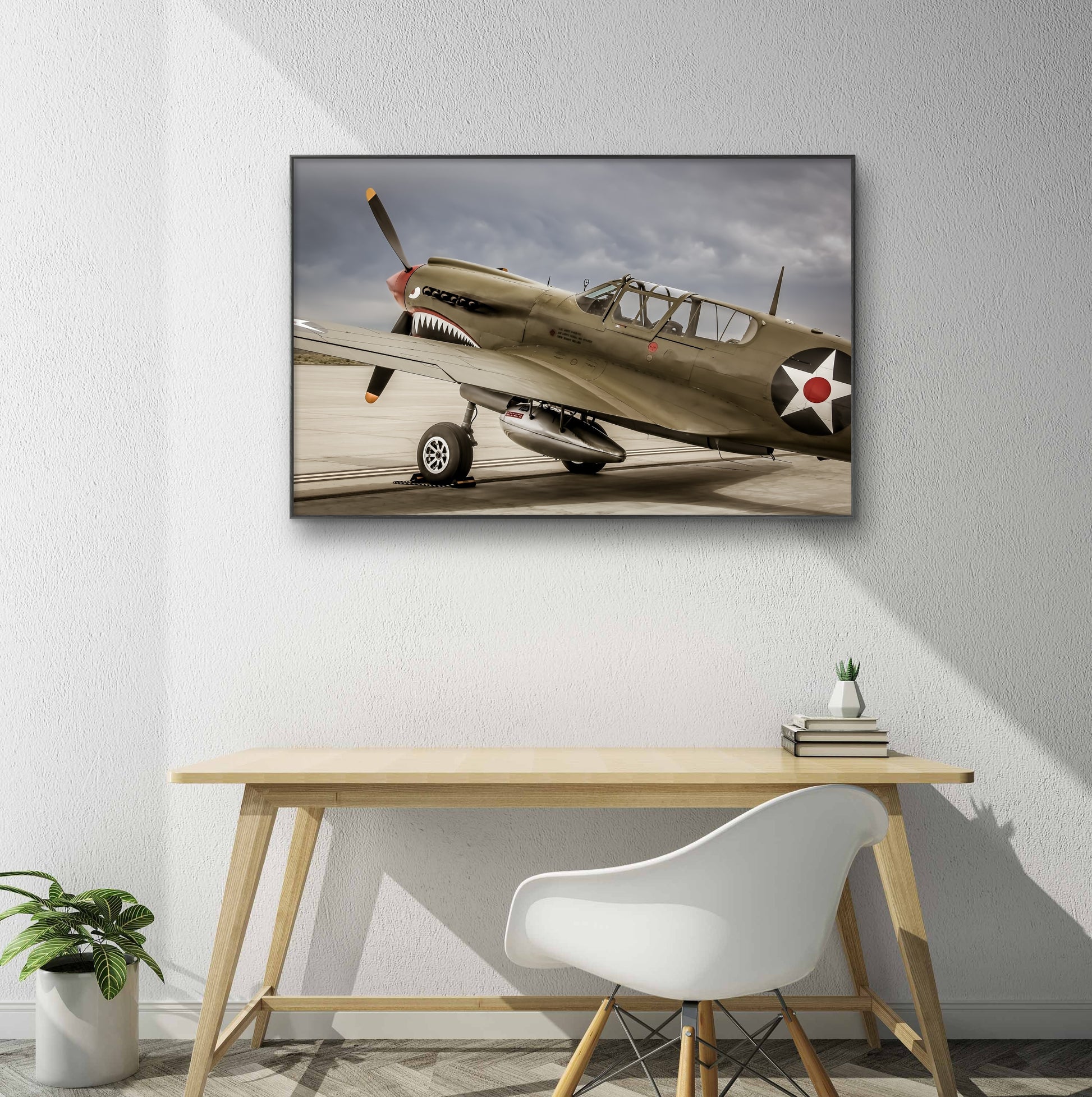 This beautiful P-40E wears the U.S. national military insignia of the star inside a blue circle which was superseded on 15 May 1942. The 'E' model is very similar to the 'D' model except for a slightly more powerful engine and six .50 cal guns in lieu of four. Add a slim, black floating frame to really set off this image. Your satisfaction is absolutely guaranteed and shipping is free!